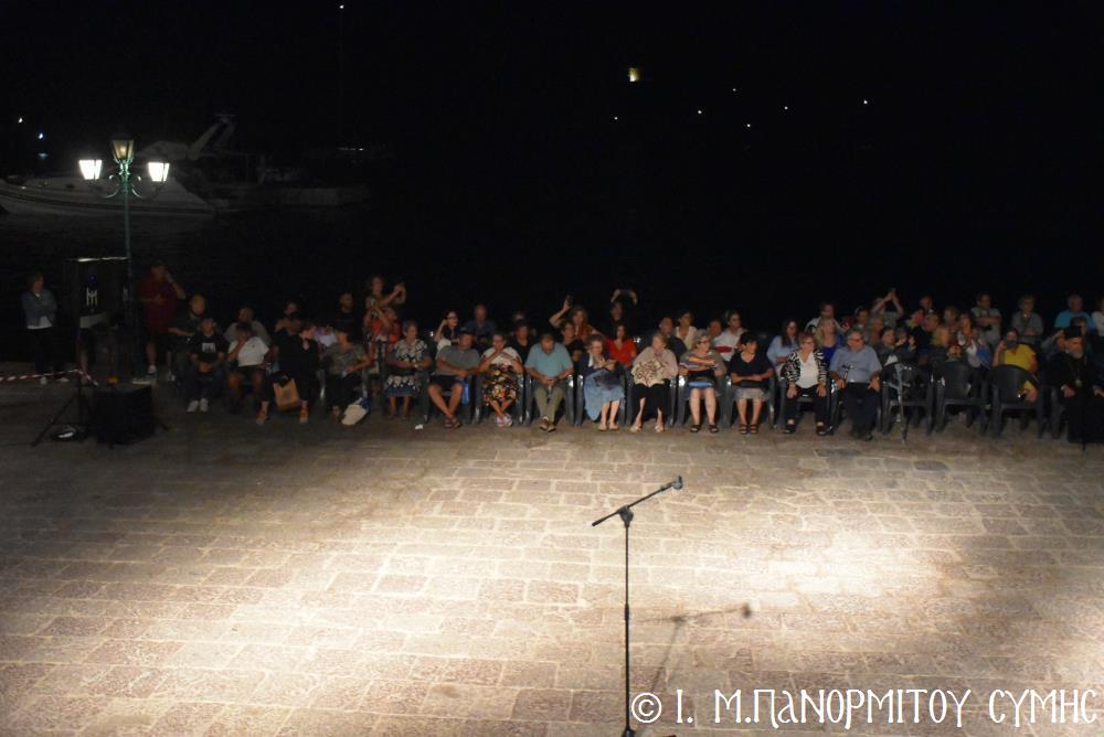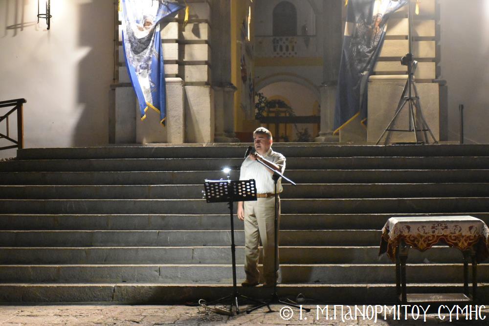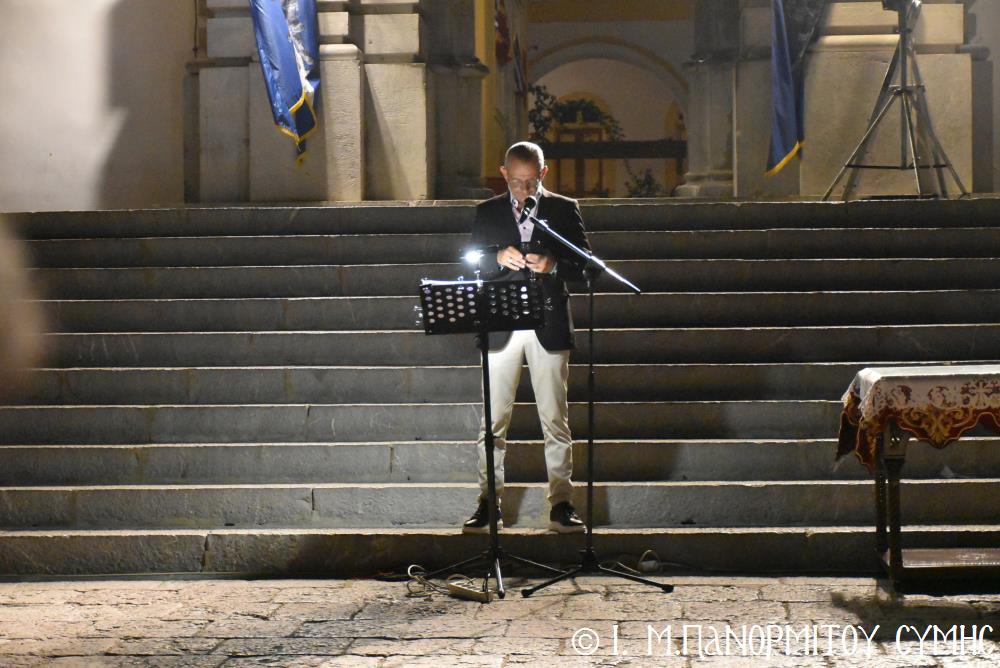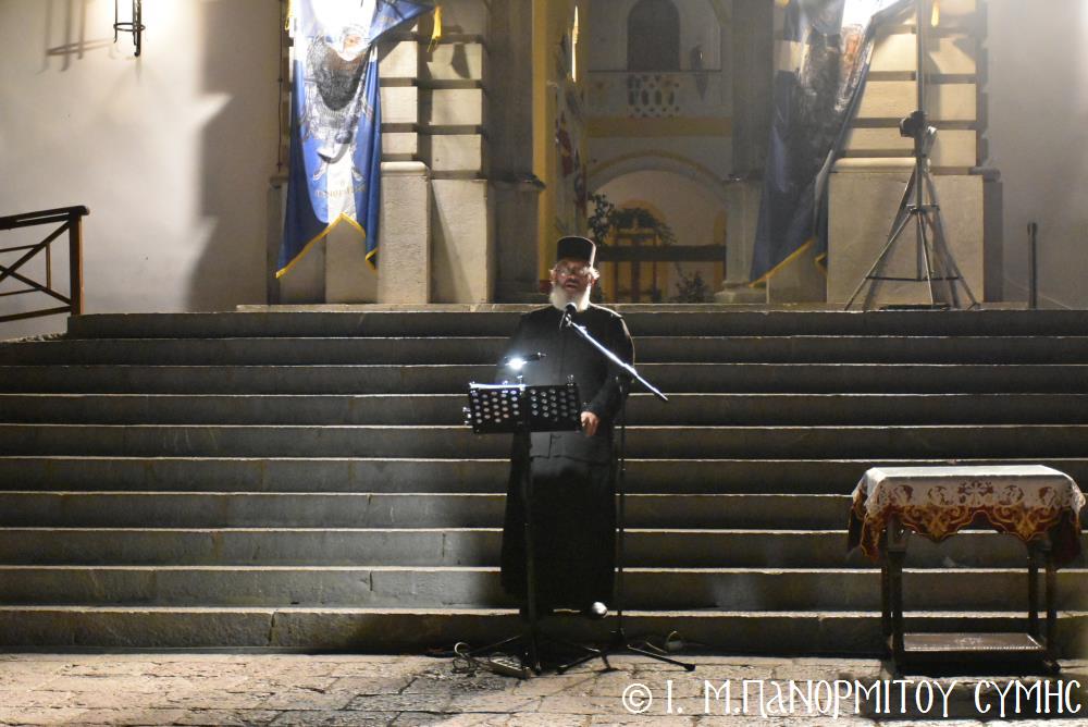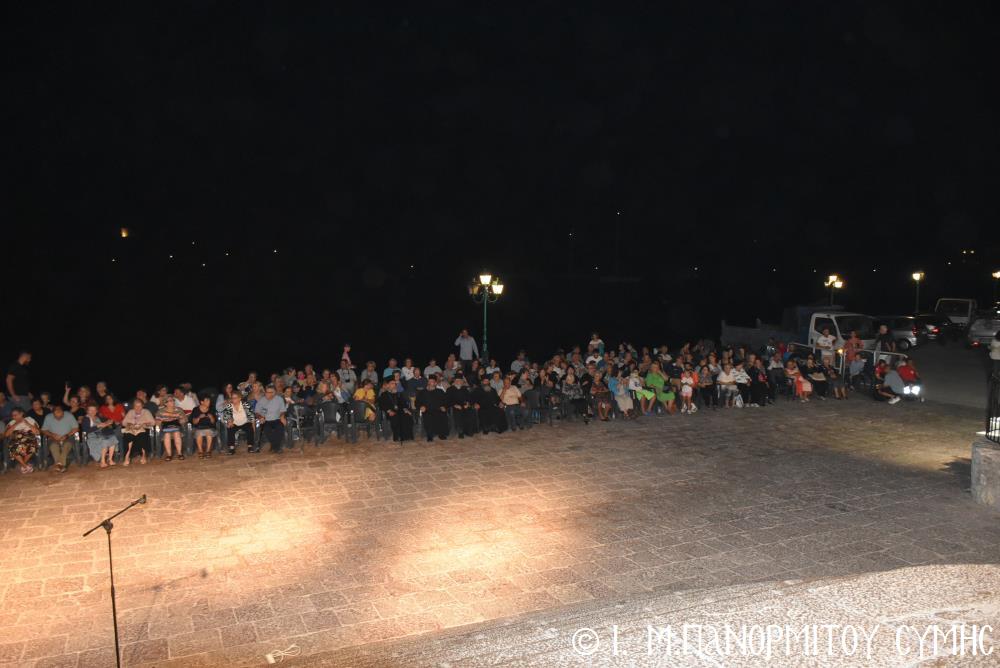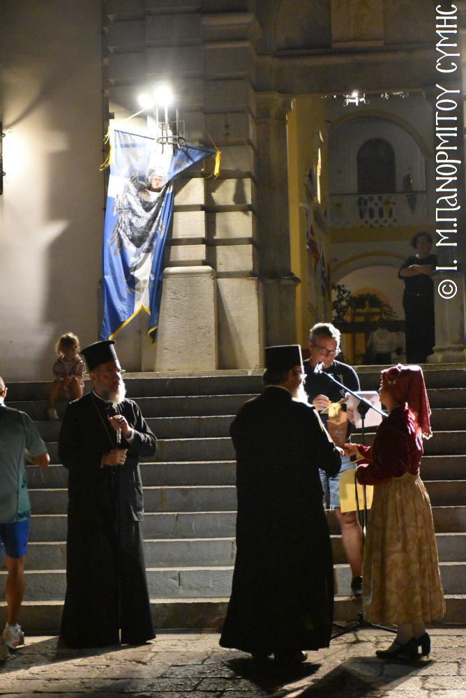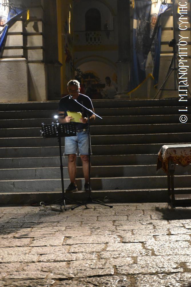 Ὁ Ἡγούμενος ξεκίνησε τήν ἐκδήλωση μέ σύντομο χαιρετισμό του, ἀκολούθησε ὁ Ἀντιδήμαρχος Σύμης καί κατόπιν τόν λόγο ἔλαβε ὁ Γραμματέας τῆς Ἱ. Μητροπόλεως Σύμης κ. Γεώργιος Πετρόπουλος, ὁ ὁποῖος ἀναφέρθηκε στά ἱστορικά γεγονότα τῆς ἐκτελέσεως τῶν τριῶν Ἐθνομαρτύρων.