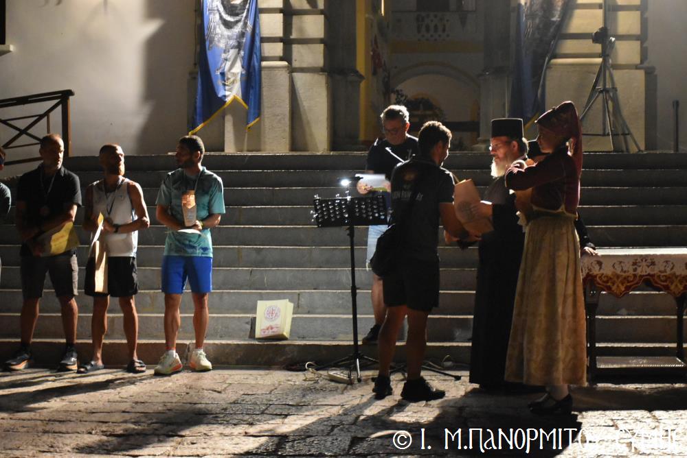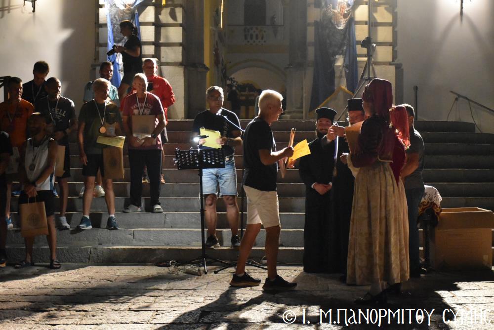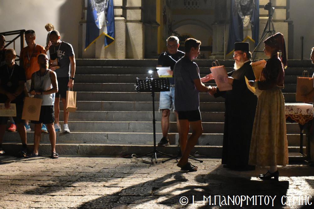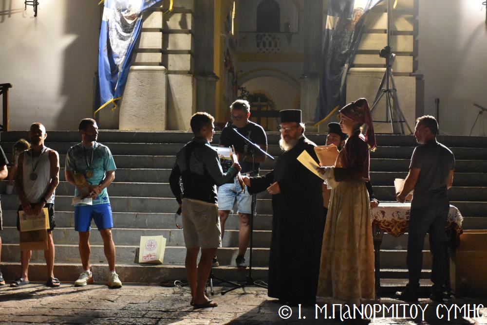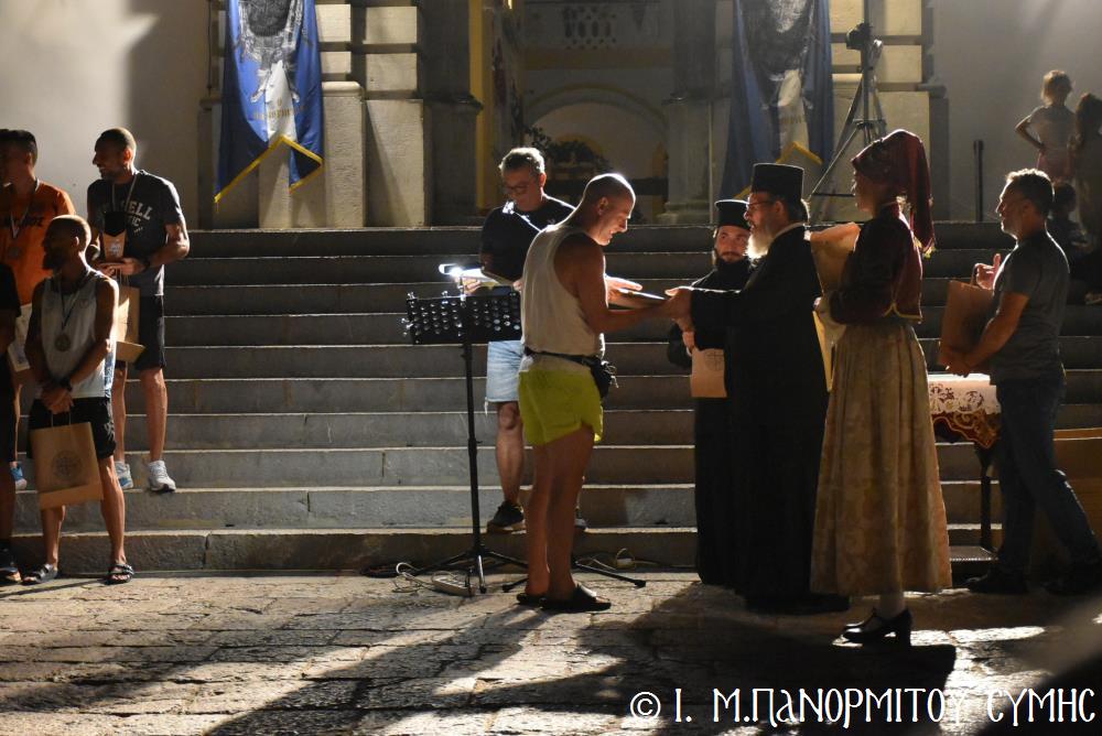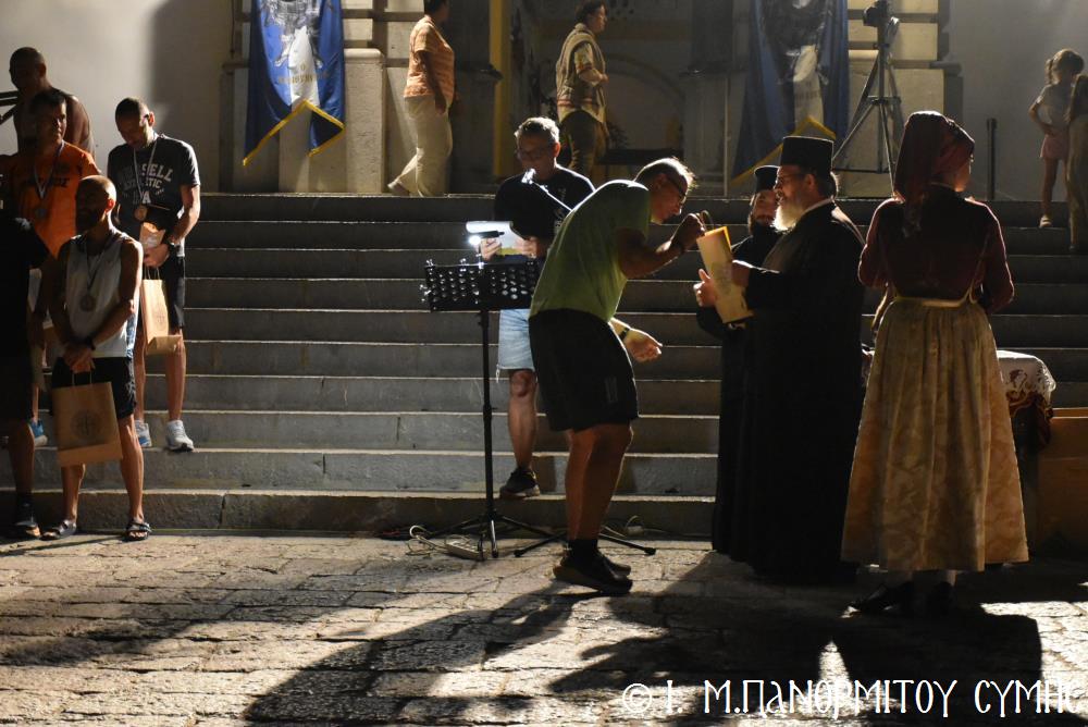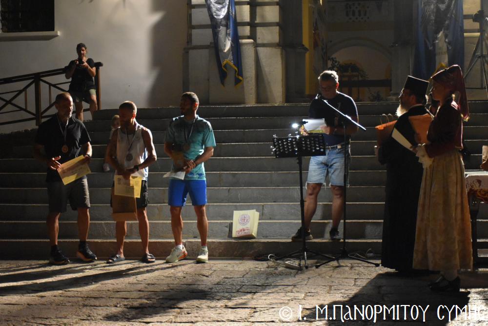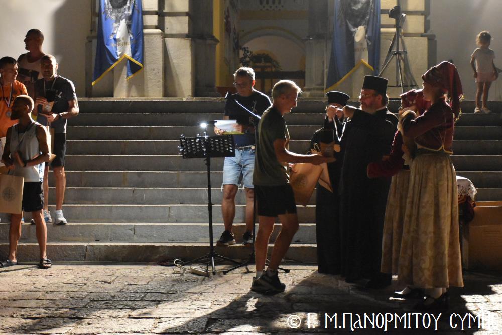 Μία ὥρα καί δεκαέξι λεπτά ἀργότερα, τερμάτισε πρῶτος ἐμπρός στήν Πύλη τῆς Μονῆς ὁ Συμαῖος Μιχαήλ Χατζηϊωάννου καί ἀκολούθησαν οἱ συμμετέχοντες δρομεῖς 43 τόν ἀριθμό, Ἕλληνες καί Ξένοι. Ὅλοι καταχειροκροτήθηκαν, ἀπό τόν Σεβ. Μητροπολίτη μας κ. Χρυσόστομο, τόν Πανοσιολ. Ἡγούμενο π. Ἀντώνιο, κληρικούς τῆς Νήσου μας, τόν Ἀντιδήμαρχο κ. Νικήτα Γρύλλη καί ἀρκετό κόσμο πού παρευρέθη στήν ἐκδήλωση.