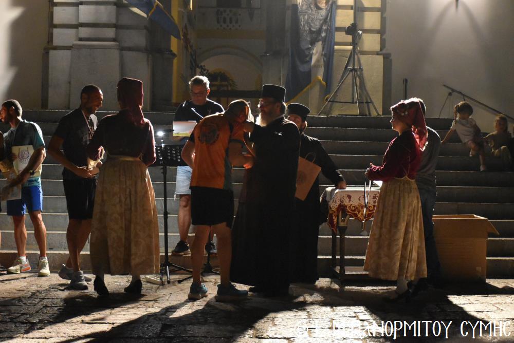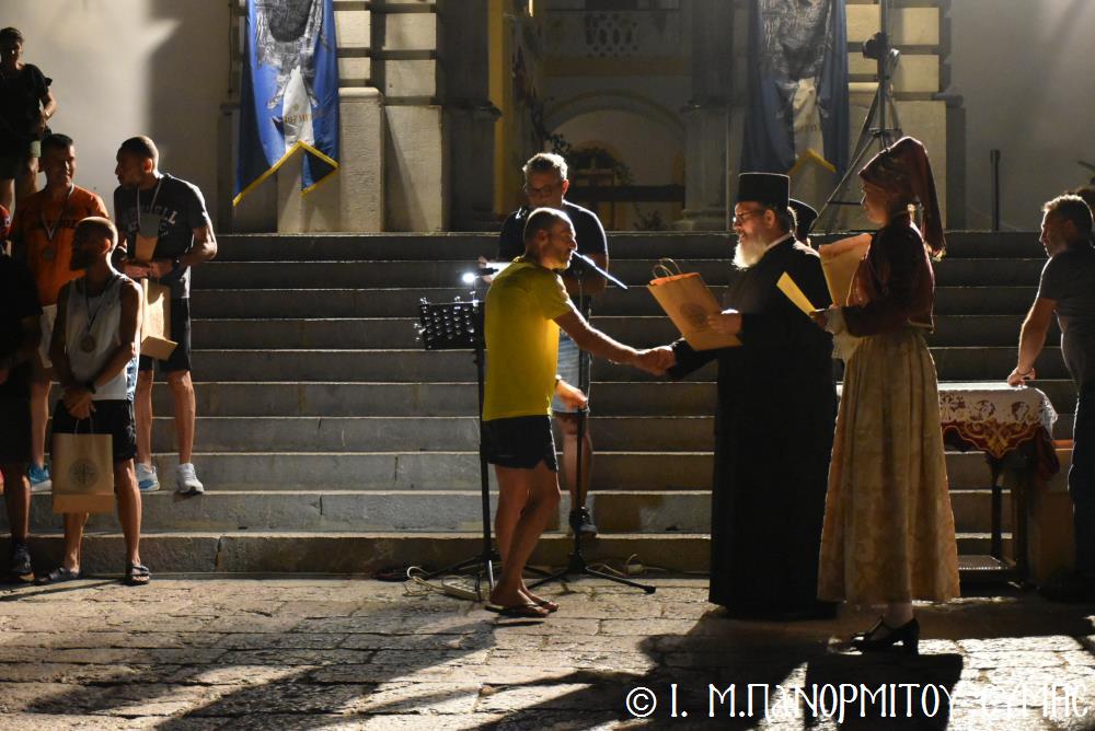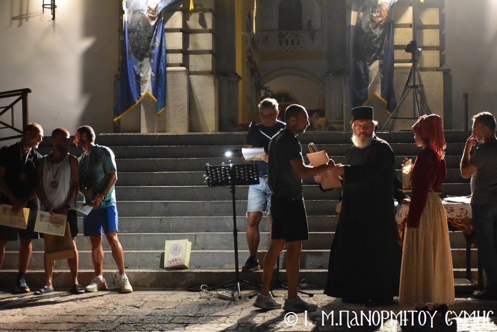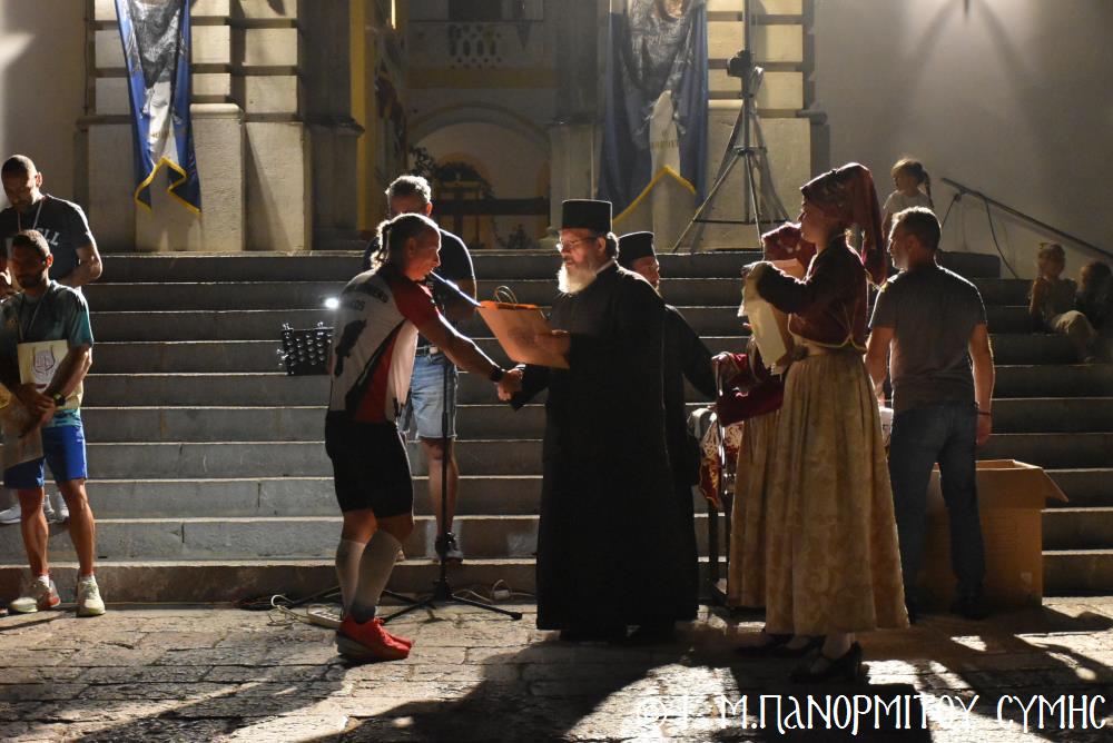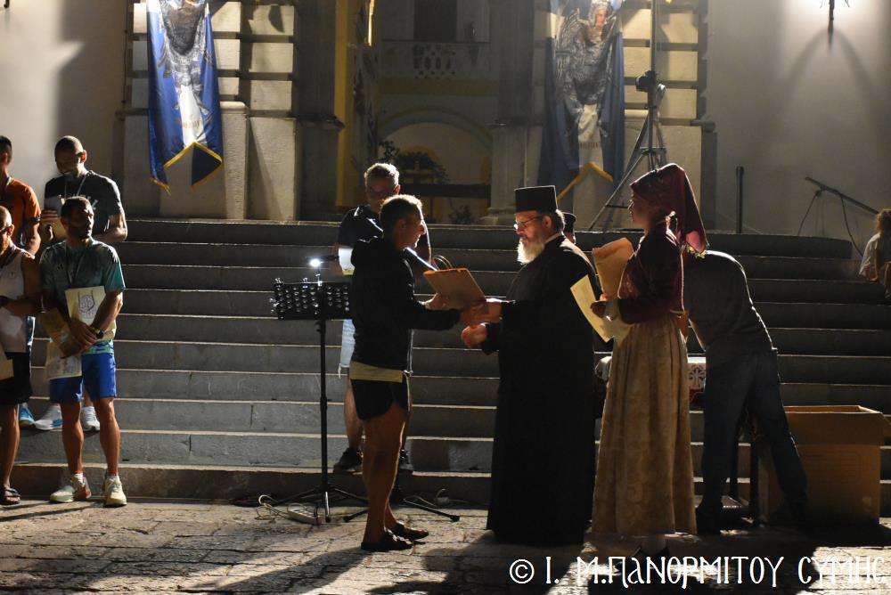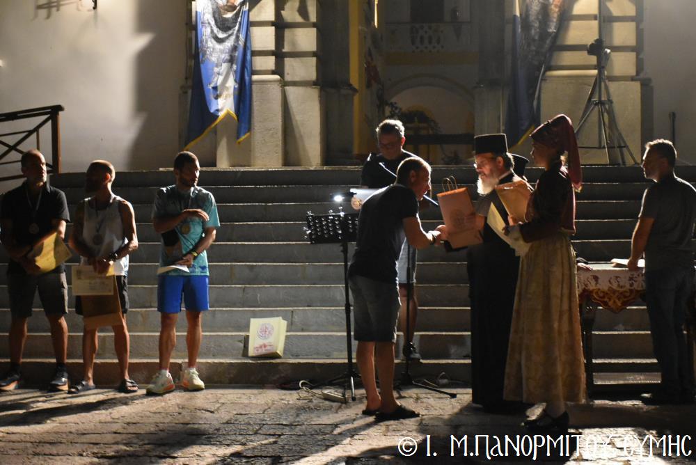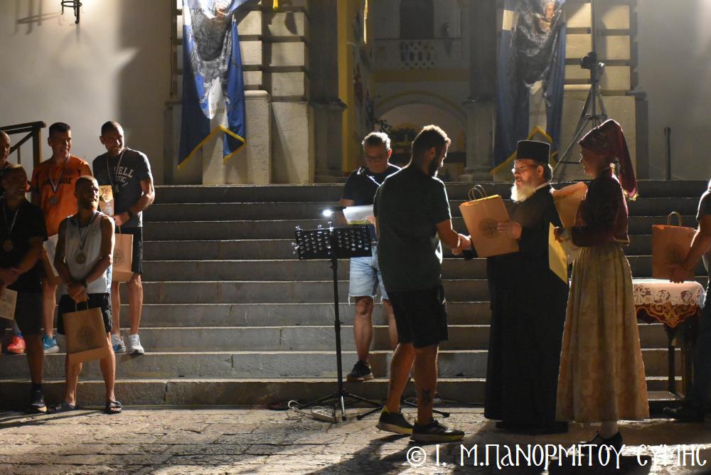 Μία ὥρα καί δεκαέξι λεπτά ἀργότερα, τερμάτισε πρῶτος ἐμπρός στήν Πύλη τῆς Μονῆς ὁ Συμαῖος Μιχαήλ Χατζηϊωάννου καί ἀκολούθησαν οἱ συμμετέχοντες δρομεῖς 43 τόν ἀριθμό, Ἕλληνες καί Ξένοι. Ὅλοι καταχειροκροτήθηκαν, ἀπό τόν Σεβ. Μητροπολίτη μας κ. Χρυσόστομο, τόν Πανοσιολ. Ἡγούμενο π. Ἀντώνιο, κληρικούς τῆς Νήσου μας, τόν Ἀντιδήμαρχο κ. Νικήτα Γρύλλη καί ἀρκετό κόσμο πού παρευρέθη στήν ἐκδήλωση.