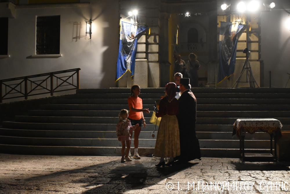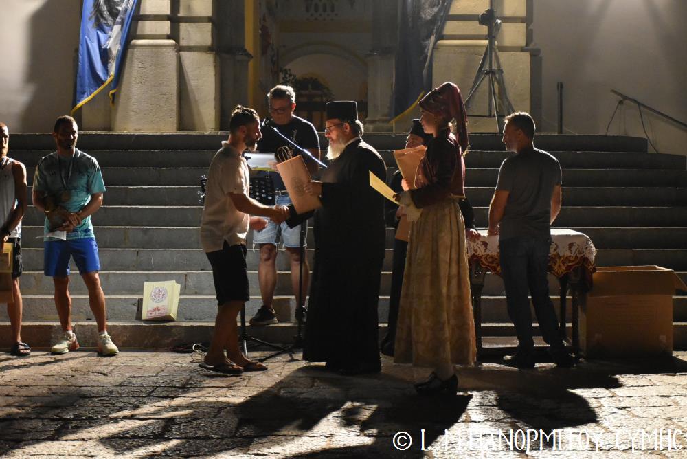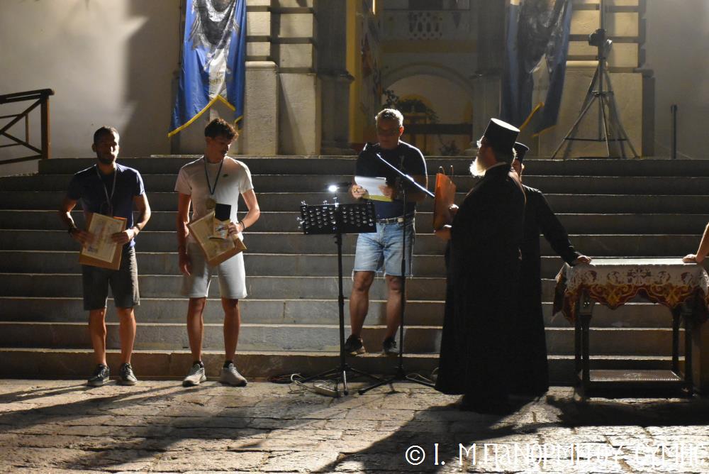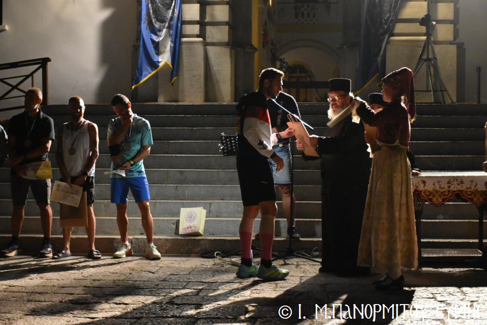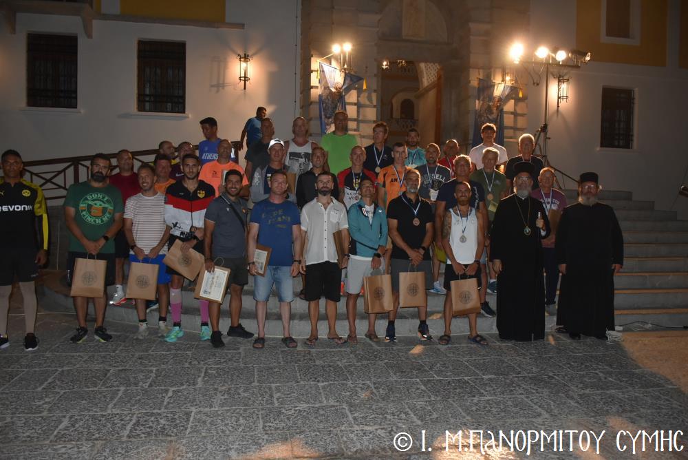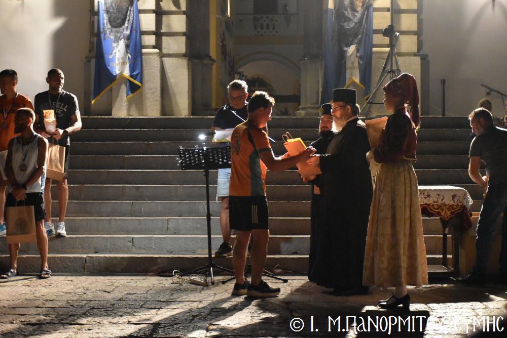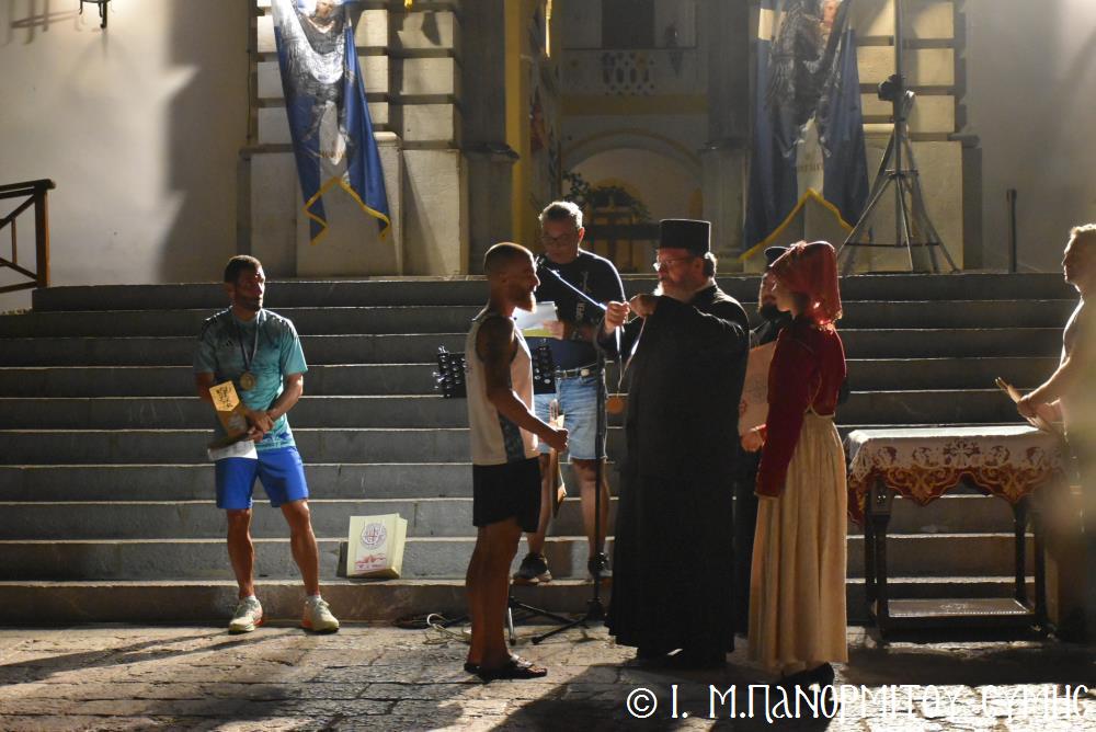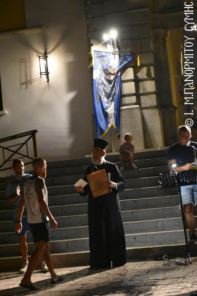 Μία ὥρα καί δεκαέξι λεπτά ἀργότερα, τερμάτισε πρῶτος ἐμπρός στήν Πύλη τῆς Μονῆς ὁ Συμαῖος Μιχαήλ Χατζηϊωάννου καί ἀκολούθησαν οἱ συμμετέχοντες δρομεῖς 43 τόν ἀριθμό, Ἕλληνες καί Ξένοι. Ὅλοι καταχειροκροτήθηκαν, ἀπό τόν Σεβ. Μητροπολίτη μας κ. Χρυσόστομο, τόν Πανοσιολ. Ἡγούμενο π. Ἀντώνιο, κληρικούς τῆς Νήσου μας, τόν Ἀντιδήμαρχο κ. Νικήτα Γρύλλη καί ἀρκετό κόσμο πού παρευρέθη στήν ἐκδήλωση.