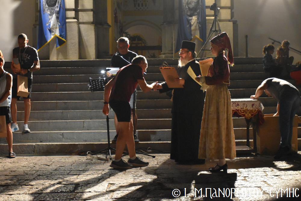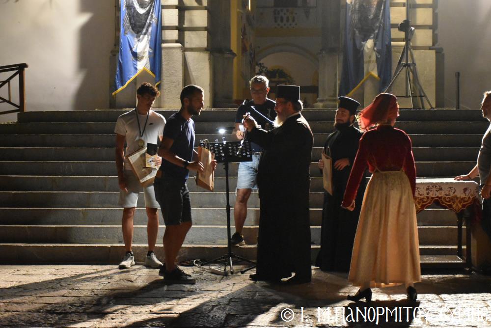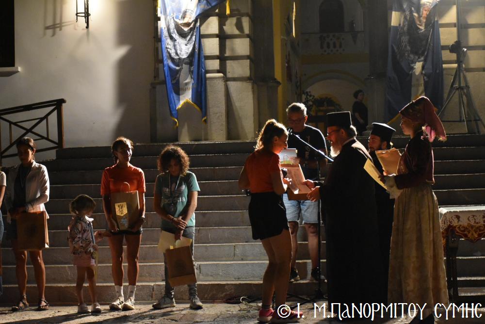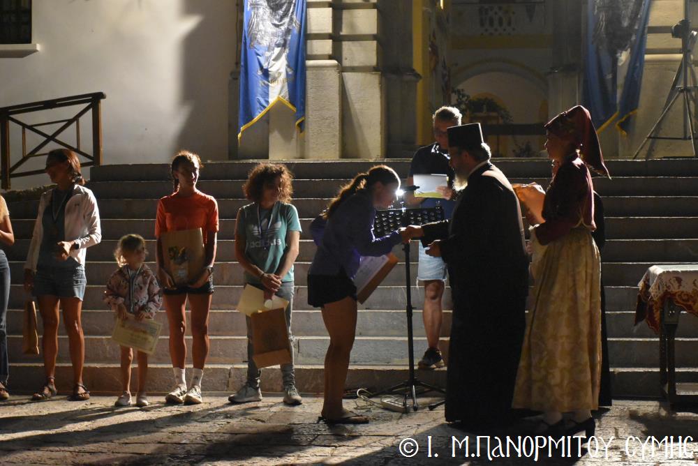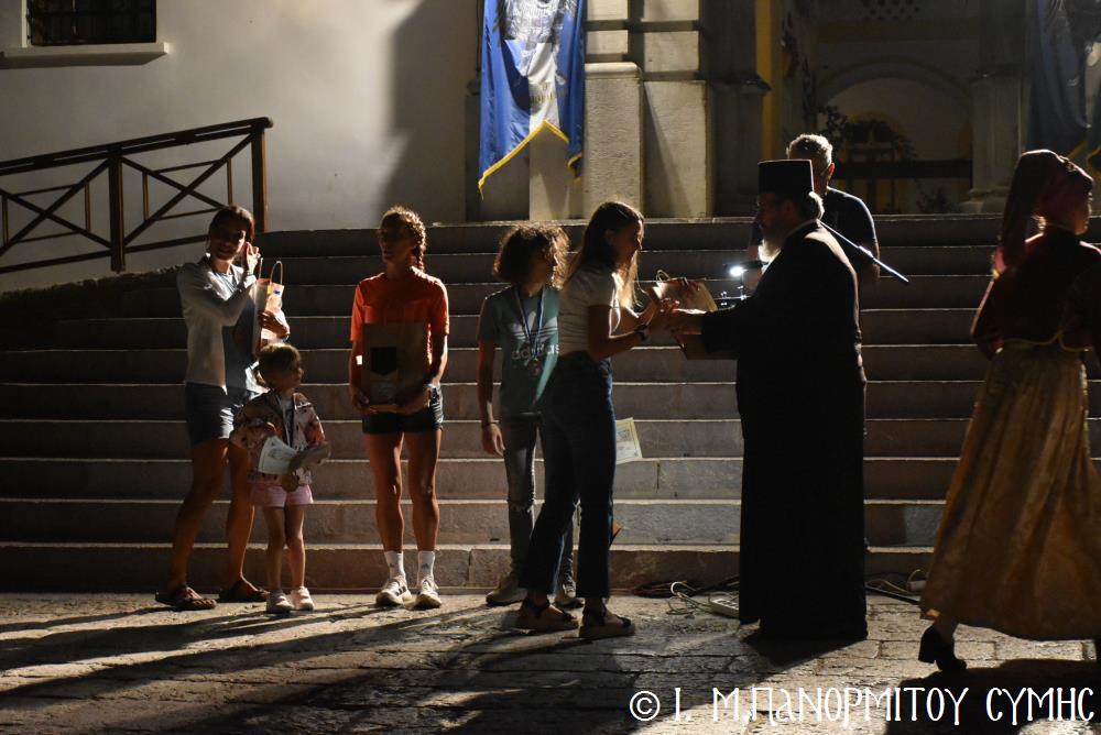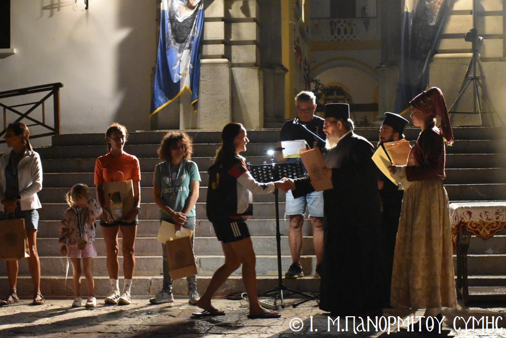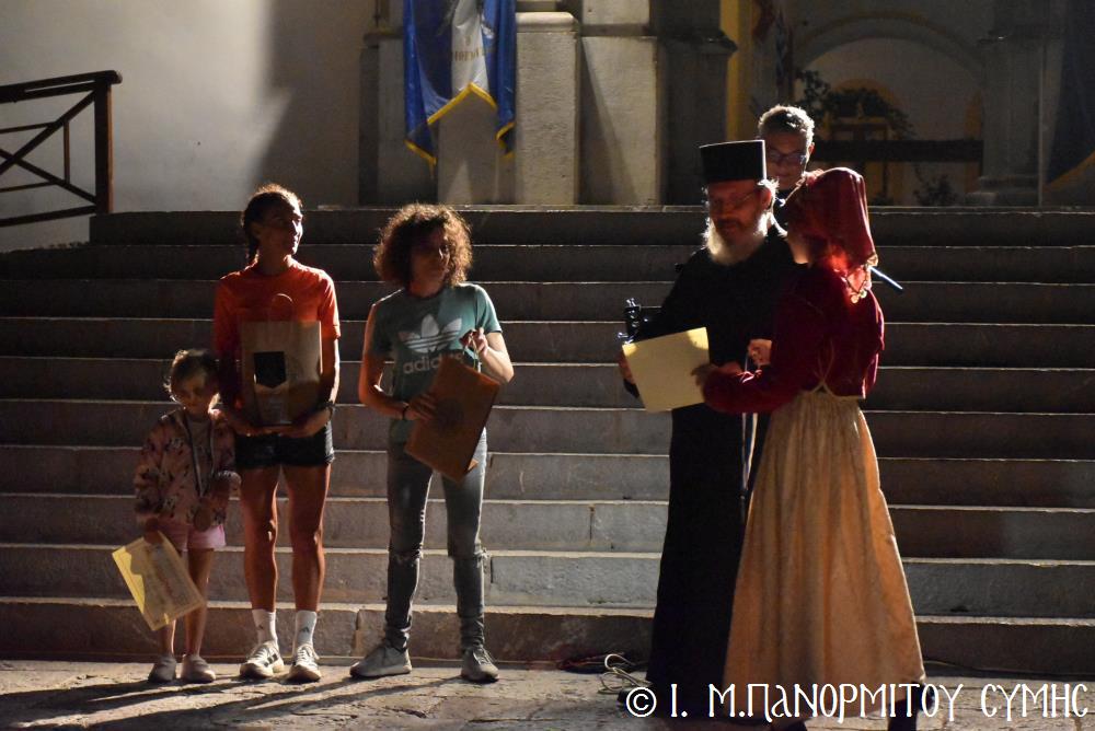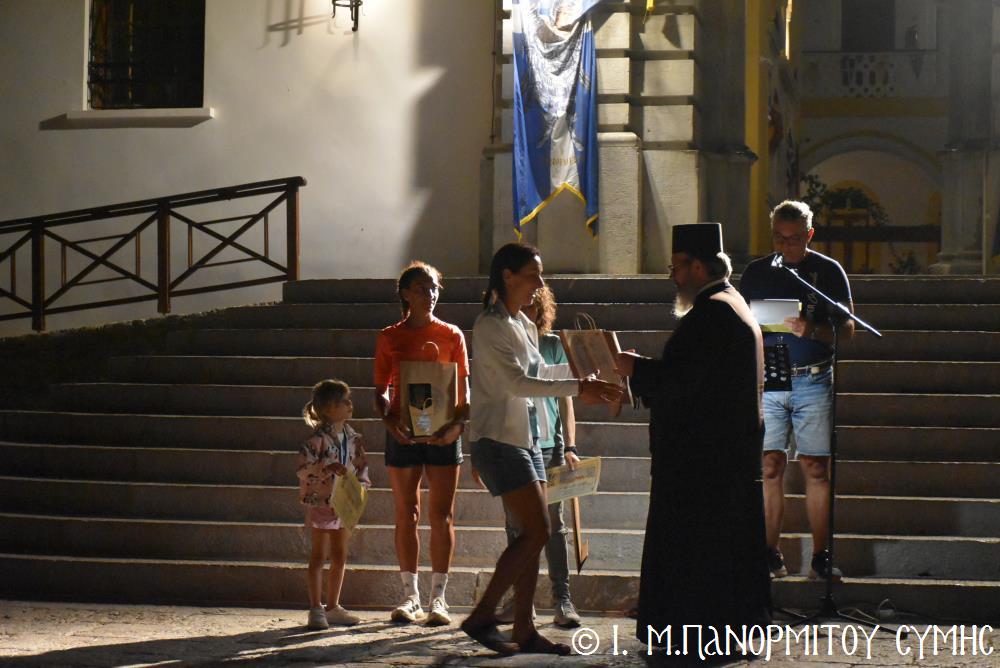 Ἐν συνεχείᾳ ὁ Σεβασμιώτατος, ἀπένειμε στούς τρεῖς πρώτους ἀνά κατηγορία, τιμητικά διπλώματα, ἐνῶ ὁ Ἀντιδήμαρχος Σύμης κ. Νικήτας Γρύλλης κύπελλα καί μετάλλια. Ὁ δέ Ἡγούμενος ἐπέδωσε στούς τρεῖς πρώτους συμβολικά χρηματικά ἔπαθλα.
