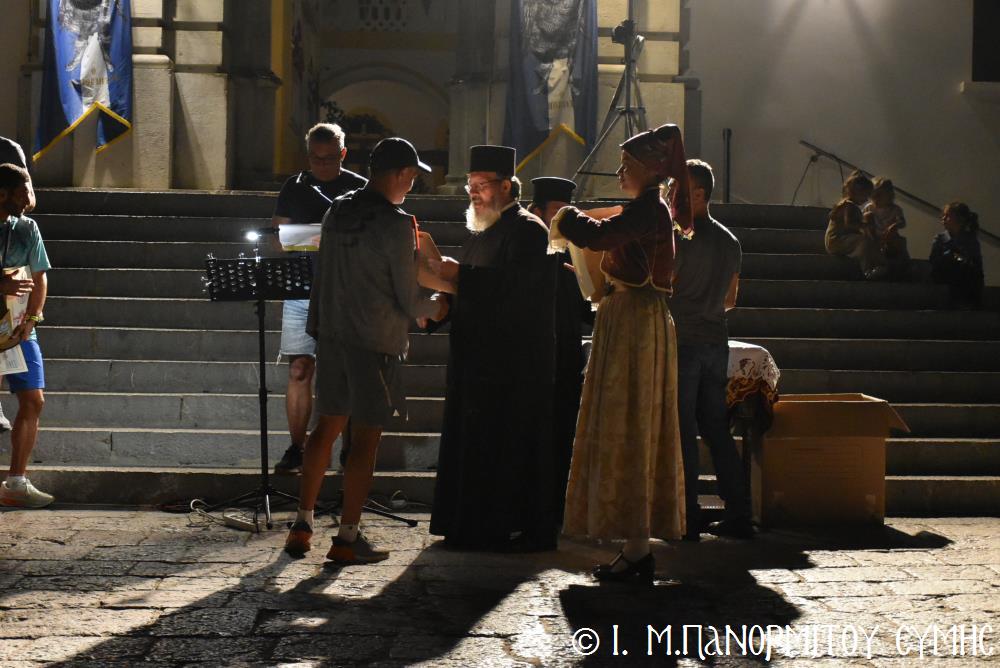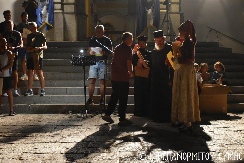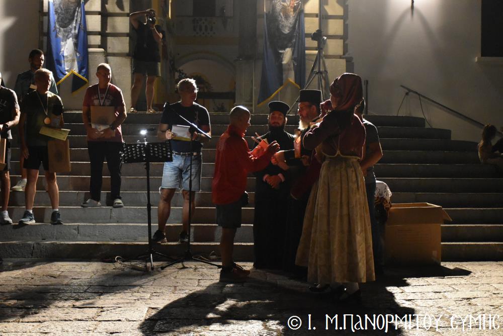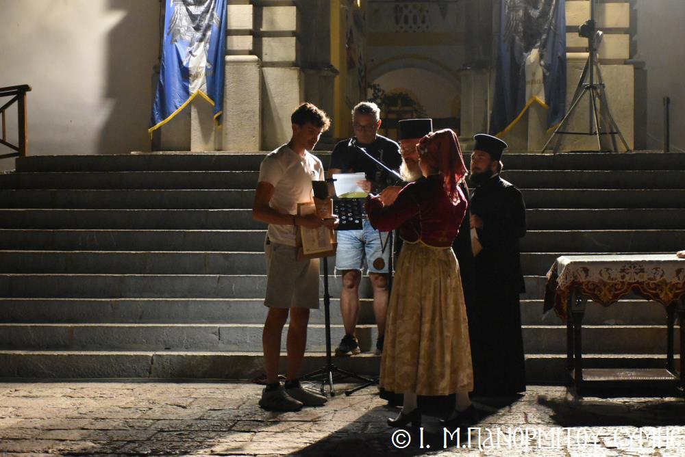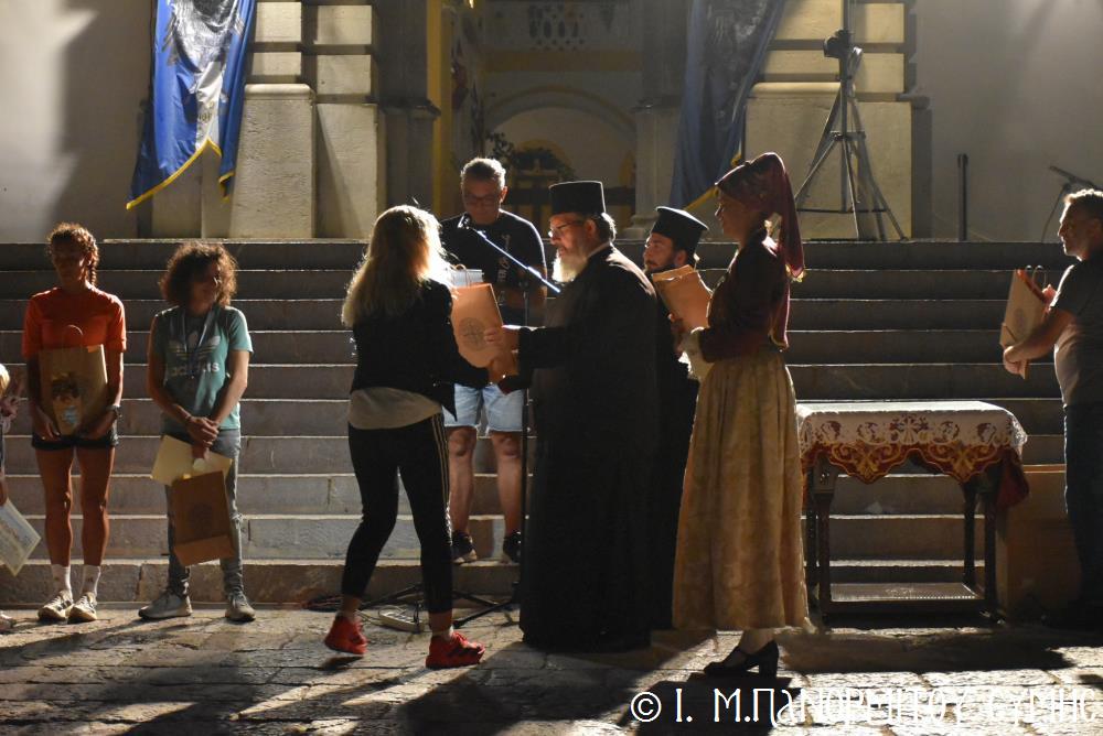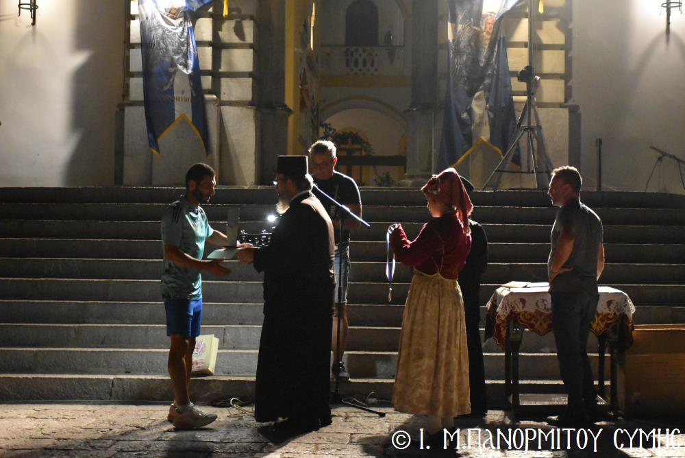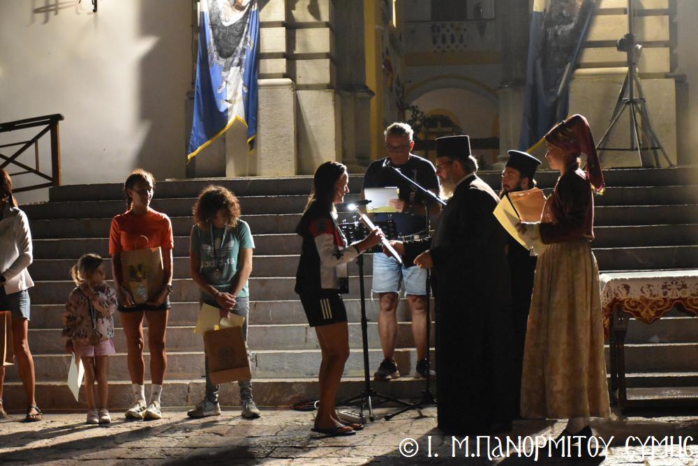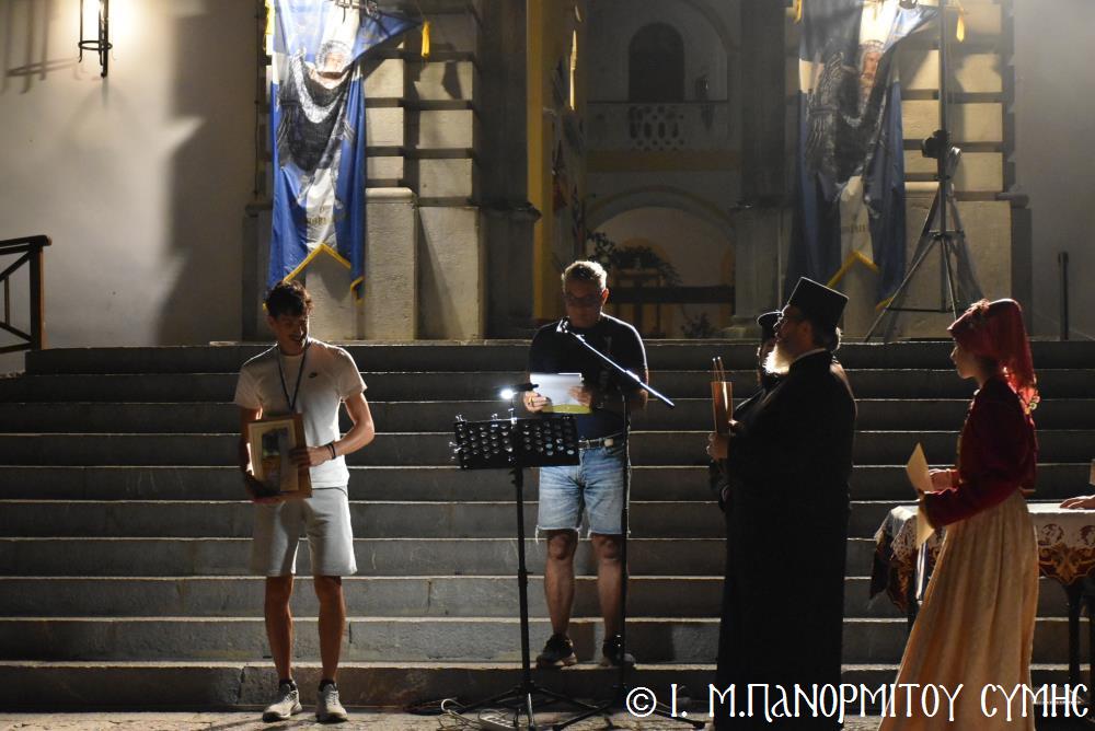 Ἐν συνεχείᾳ ὁ Σεβασμιώτατος, ἀπένειμε στούς τρεῖς πρώτους ἀνά κατηγορία, τιμητικά διπλώματα, ἐνῶ ὁ Ἀντιδήμαρχος Σύμης κ. Νικήτας Γρύλλης κύπελλα καί μετάλλια. Ὁ δέ Ἡγούμενος ἐπέδωσε στούς τρεῖς πρώτους συμβολικά χρηματικά ἔπαθλα.