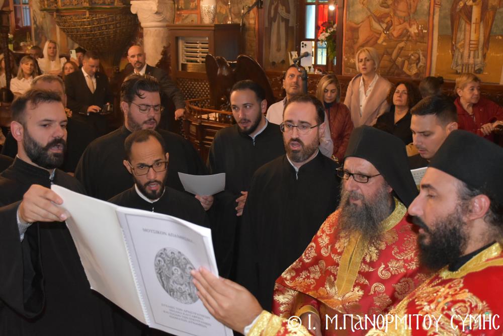 Σήμερα τό πρωΐ, Σάββατο 8η Νοεμβρίου, κυριώνυμος ἡμέρα τῆς Πανηγύρεως, ὁ Σεβ. Ποιμενάρχης μας κ. Χρυσόστομος, χοροστάτησε στόν Ὄρθρο καί προεξάρχων τῆς Εὐχαριστιακῆς Συνάξεως, τέλεσε τήν Θεία Λειτουργία μετά τῶν ὡς ἄνω κληρικῶν, ἐνῶ τά Ἀναλόγια καθ’ ὅλας τάς Ἱ. Ἀκολουθίας διηκόνησε γλυκυφθόγγως πολυμελής Βυζαντινή Χορωδία ὑπό τήν διεύθυνση τοῦ Χοράρχου καί Πρωτοψάλτου κ. Γεωργίου Ρισάνου ἐξ Ἀθηνῶν.