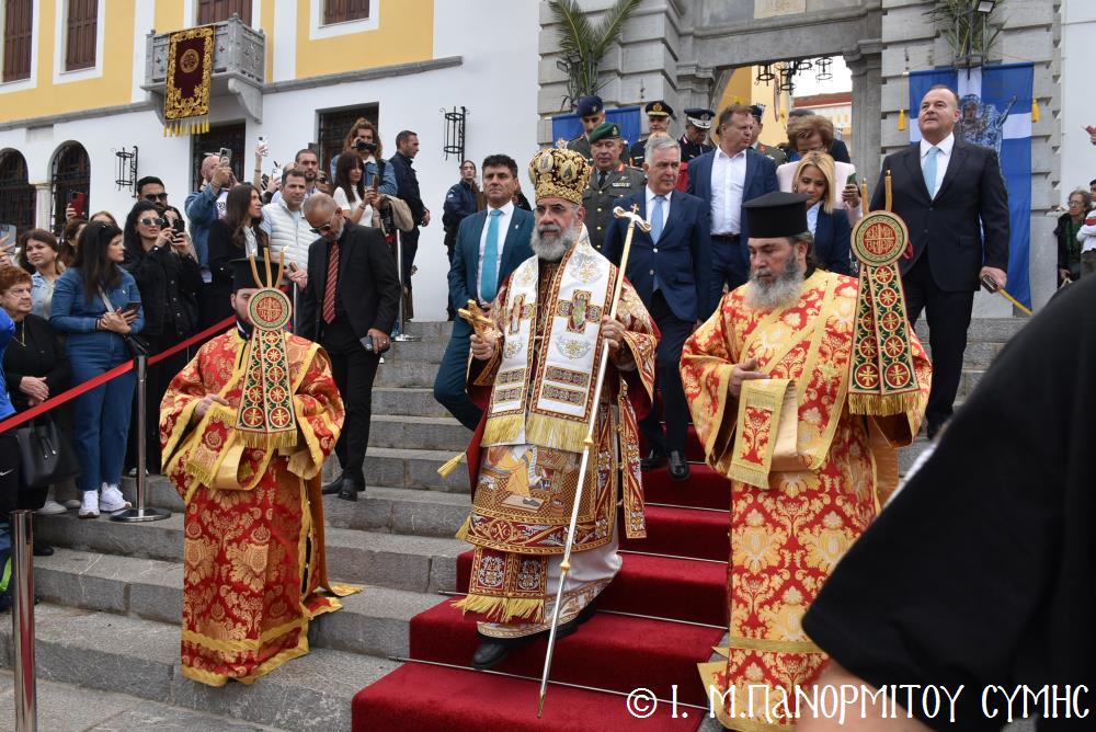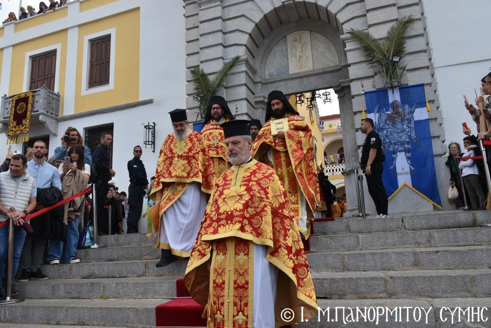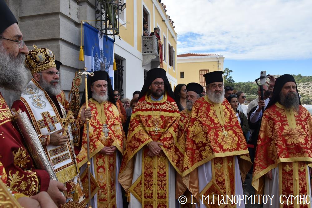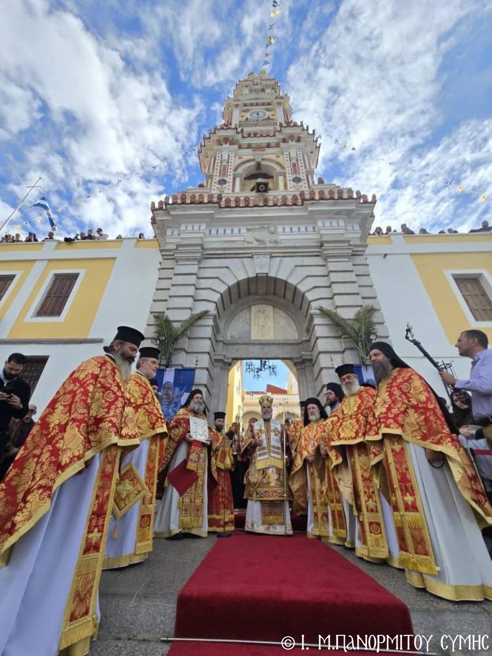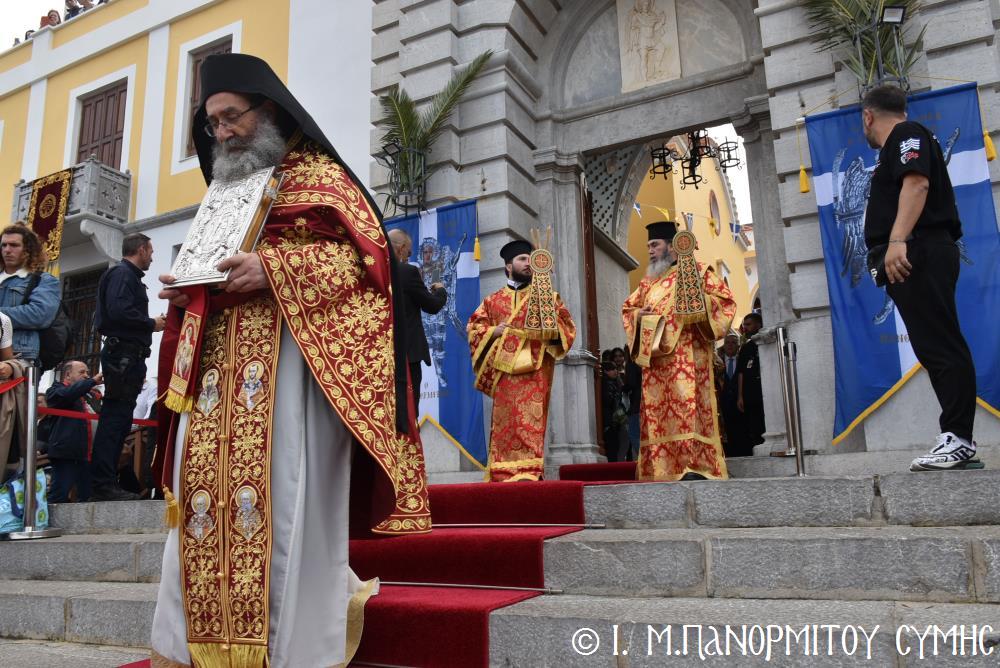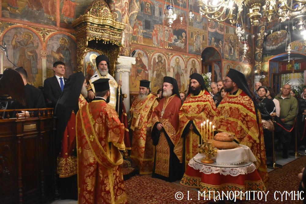 Ἡ Λιτανεία τέλος, κατέληξε καὶ πάλι στὴν κεντρικὴ Πύλη, ὅπου ἀνεπέμφθη ἡ καθιερωμένη Δέησις καί ὁ Σεβ. Ποιμενάρχης μας κ. Χρυσόστομος ἔκανε τήν Ἀπόλυση, εὐχαριστῶν ὅλους τούς ἐπωνύμους καὶ ἀνωνύμους γιὰ τὴν παρουσία τους, τὸν ἱερὸ Κλῆρο καὶ τὸν Λαὸ γιὰ τὴν ἀγάπη τους καὶ τὴν συμμετοχή τους, τόν ἐψηφισμένο Ἐπίσκοπο Ροδοστόλου - Ἡγούμενο καί τὰ μέλη τῆς Ἐφορείας τῆς Ἱερᾶς Μονῆς, τοὺς Ἱεροψάλτες, τοὺς Τοπικοὺς Φορεῖς καὶ τοὺς πολλοὺς ἐθελοντὲς γιὰ τὴν συνεργασία καὶ τὴν βοήθειά τους στὴν ἄρτια διοργάνωση καί ὑλοποίηση καί τῆς ἐφετινῆς Πανηγύρεως. Ὁ Σεβασμιώτατος ἀνεφέρθη ἰδιαιτέρως στήν δημοσίευση τοῦ Προεδρικοῦ Διατάγματος ὑπ’ ἀριθ. 90/2025 στὸ ΦΕΚ μέ ἀριθ. 182/Α΄/23-10-2025, διά τοῦ ὁποίου καθιερώνεται πλέον καί ἐπισήμως ὡς ἀργία διὰ τὸν Δῆμο Σύμης ἡ 8η Νοεμβρίου, ἡμέρα τῆς ἑορτῆς τοῦ Παμμεγίστου Ταξιάρχου Μιχαήλ τοῦ Πανορμίτου, Προστάτου καί «Πολιούχου» τῆς Νήσου Σύμης.