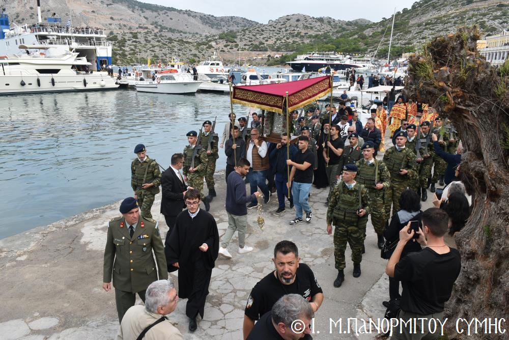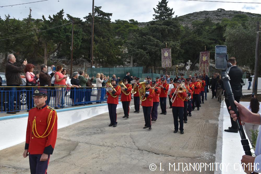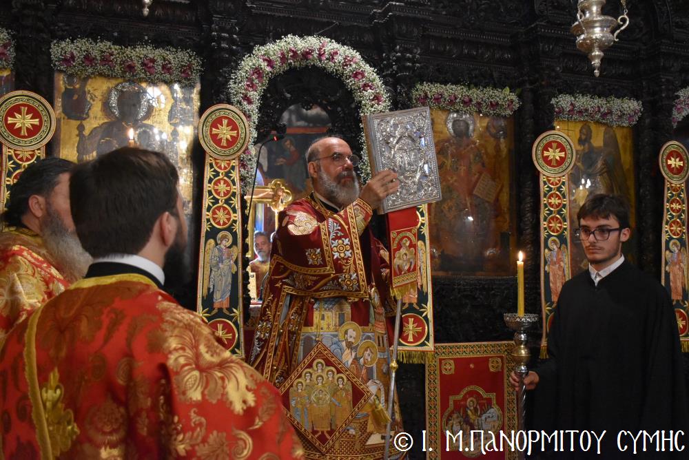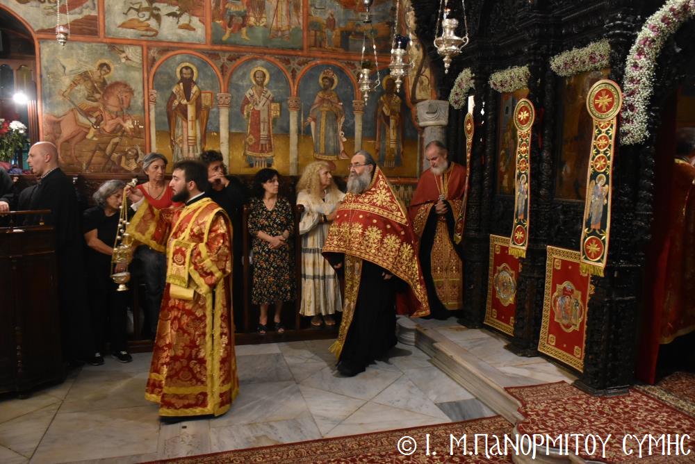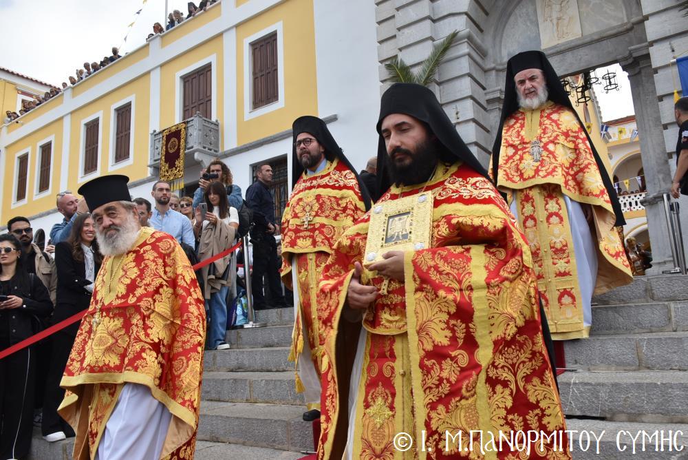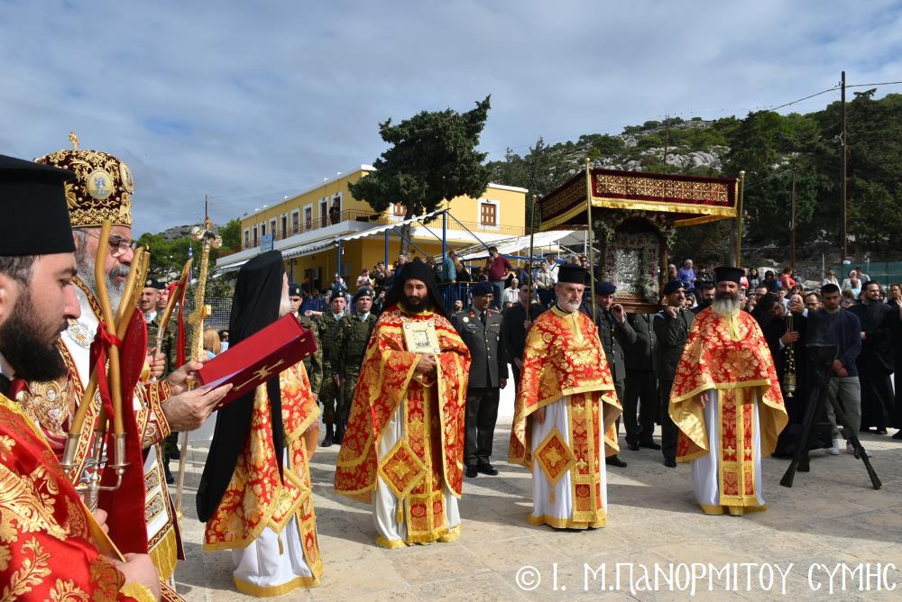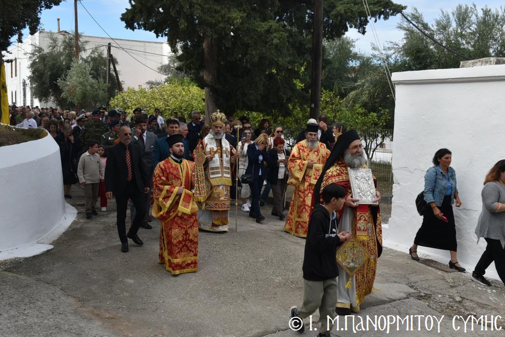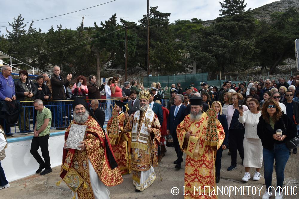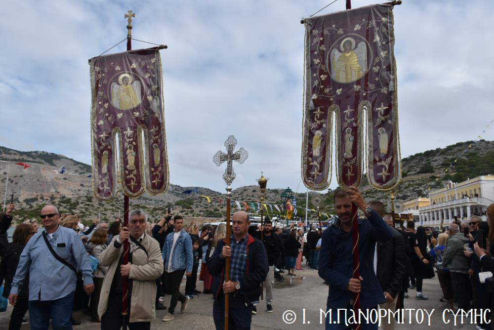 Μετὰ τὴν Ἀπόλυση, πραγματοποιήθηκε πέριξ τοῦ ἐπιβλητικοῦ κτιριακοῦ συγκροτήματος τῆς Ἱ. Μονῆς, ἡ μεγαλειώδης Λιτάνευσις τῆς Εἰκόνος τοῦ Ταξιάρχου Μιχαήλ, προπορευομένων τοῦ Τιμίου Σταυροῦ, τῶν Ἑξαπτερύγων, τῶν Λαβάρων, τῆς Φιλαρμονικῆς τοῦ Δήμου Ροδίων καί τῶν Ἱεροψαλτῶν, περιστοιχιζομένης τιμητικῶς ἀπό Στρατιωτικό Ἄγημα τῆς Φρουρᾶς τῆς Σύμης καί ἀκολουθοῦντος τοῦ Ἱ. Κλήρου, τῶν Ἀρχῶν καί τοῦ Χριστεπωνύμου Λαοῦ. Ὅταν ἡ Ἱ. Εἰκόνα ἐξῆλθε τῆς κεντρικῆς Πύλης τῆς Μονῆς, ἀλλὰ καὶ καθ’ ὅλη τὴν διάρκεια τῆς Λιτανείας, τὰ ἀγκυροβολημένα στὴν προκυμαία πολυάριθμα πλοῖα καί σκάφη, προερχόμενα ἀπ’ ὅλο τό νησιωτικό σύμπλεγμα τῆς Δωδεκανήσου, συνόδευαν τὴν Ἱερά Εἰκόνα μὲ τοὺς χαρούμενους συριγμούς τους, ἀναμεμιγμένους μὲ τὶς πανηγυρικὲς κωδωνοκρουσίες τοῦ ἱστορικοῦ Καμπαναριοῦ τοῦ Πανορμίτη, ἐπιβεβαιώνοντας ἐμπράκτως τὴν παλαιὰ παράδοση, ποὺ θέλει τὸν Ἀρχάγγελο τῆς Σύμης προστάτη καὶ τῶν ναυτικῶν μας.