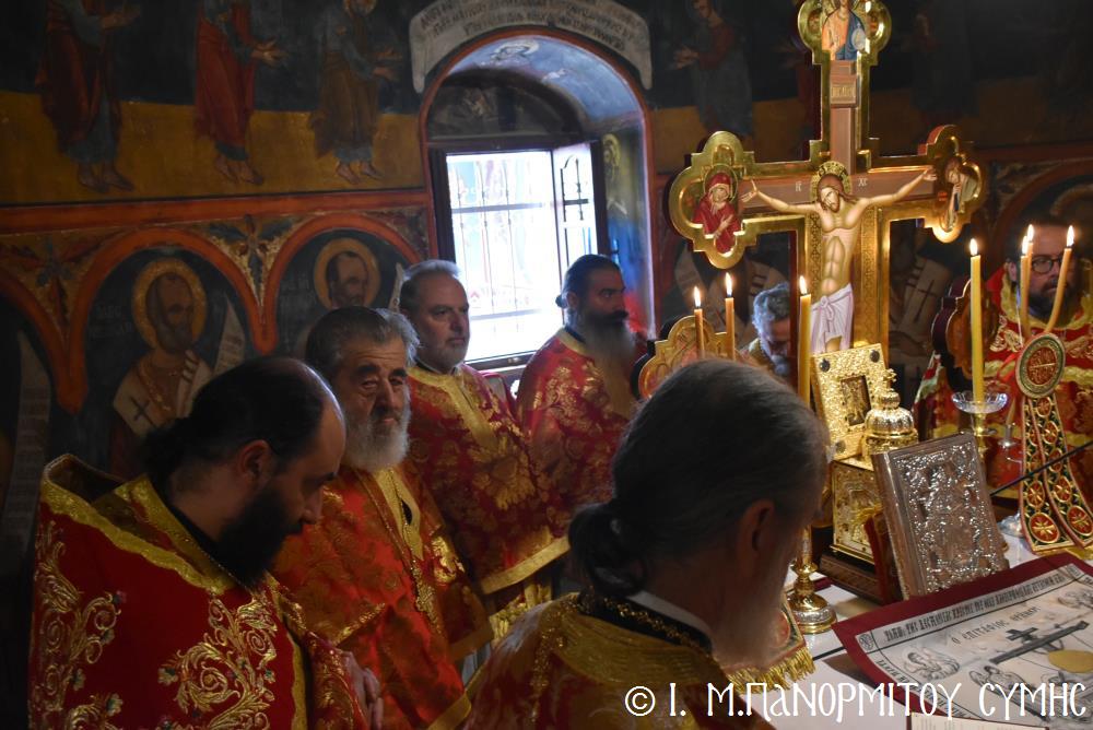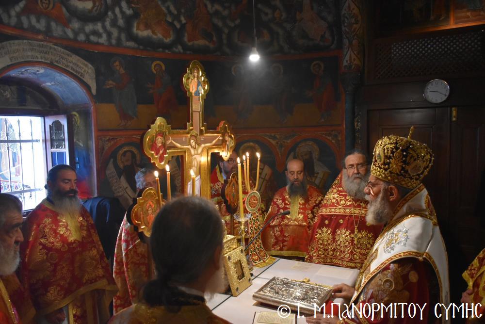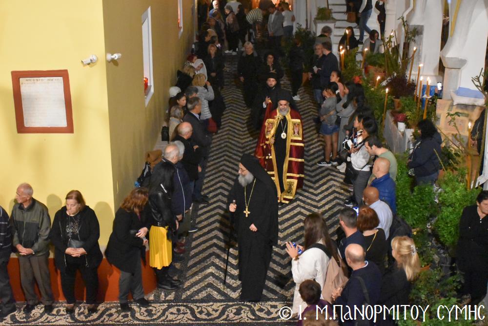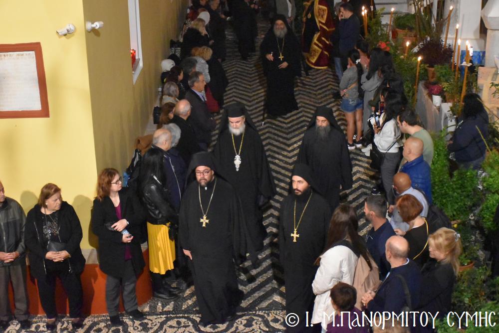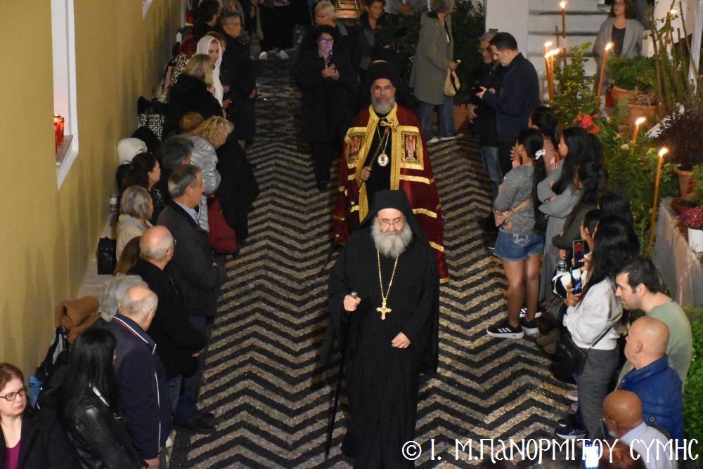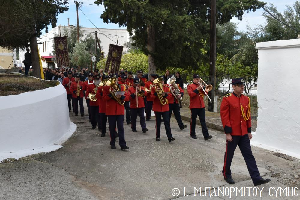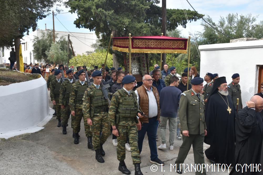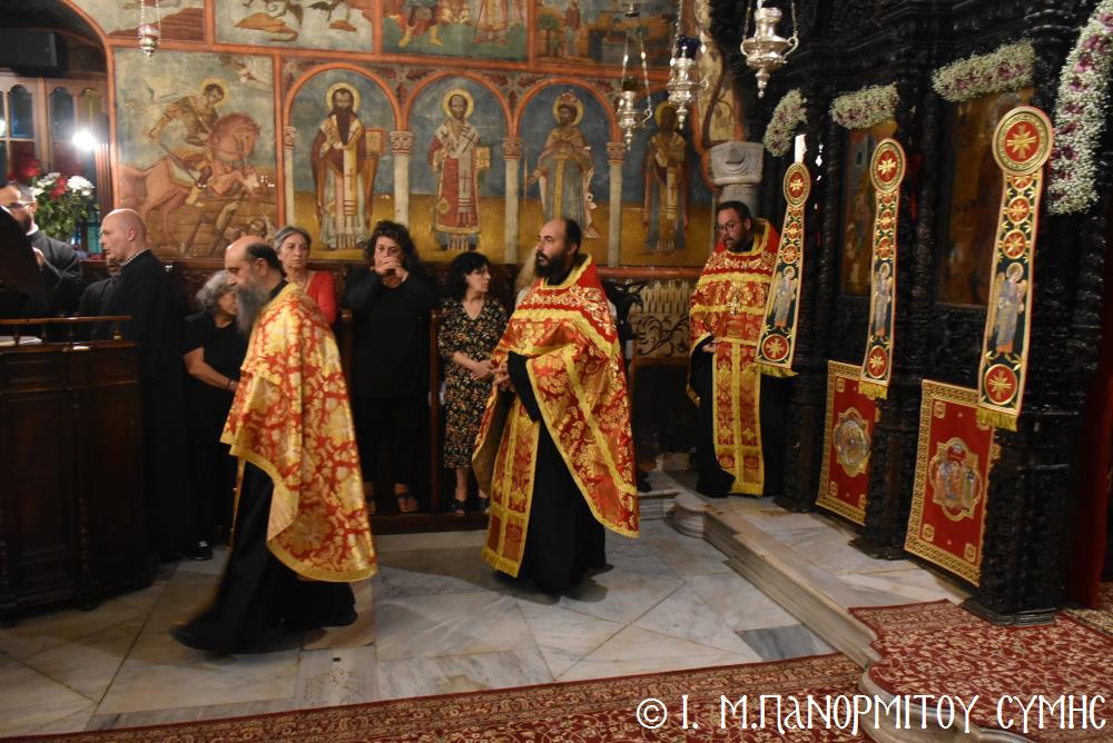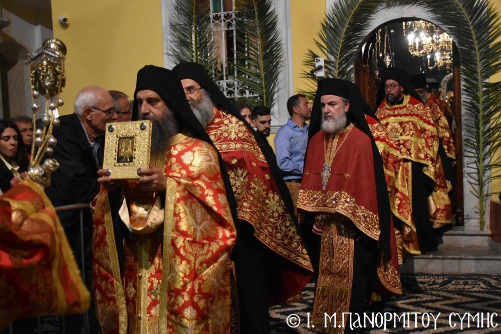 Μετὰ τὴν Ἀπόλυση, πραγματοποιήθηκε πέριξ τοῦ ἐπιβλητικοῦ κτιριακοῦ συγκροτήματος τῆς Ἱ. Μονῆς, ἡ μεγαλειώδης Λιτάνευσις τῆς Εἰκόνος τοῦ Ταξιάρχου Μιχαήλ, προπορευομένων τοῦ Τιμίου Σταυροῦ, τῶν Ἑξαπτερύγων, τῶν Λαβάρων, τῆς Φιλαρμονικῆς τοῦ Δήμου Ροδίων καί τῶν Ἱεροψαλτῶν, περιστοιχιζομένης τιμητικῶς ἀπό Στρατιωτικό Ἄγημα τῆς Φρουρᾶς τῆς Σύμης καί ἀκολουθοῦντος τοῦ Ἱ. Κλήρου, τῶν Ἀρχῶν καί τοῦ Χριστεπωνύμου Λαοῦ. Ὅταν ἡ Ἱ. Εἰκόνα ἐξῆλθε τῆς κεντρικῆς Πύλης τῆς Μονῆς, ἀλλὰ καὶ καθ’ ὅλη τὴν διάρκεια τῆς Λιτανείας, τὰ ἀγκυροβολημένα στὴν προκυμαία πολυάριθμα πλοῖα καί σκάφη, προερχόμενα ἀπ’ ὅλο τό νησιωτικό σύμπλεγμα τῆς Δωδεκανήσου, συνόδευαν τὴν Ἱερά Εἰκόνα μὲ τοὺς χαρούμενους συριγμούς τους, ἀναμεμιγμένους μὲ τὶς πανηγυρικὲς κωδωνοκρουσίες τοῦ ἱστορικοῦ Καμπαναριοῦ τοῦ Πανορμίτη, ἐπιβεβαιώνοντας ἐμπράκτως τὴν παλαιὰ παράδοση, ποὺ θέλει τὸν Ἀρχάγγελο τῆς Σύμης προστάτη καὶ τῶν ναυτικῶν μας.