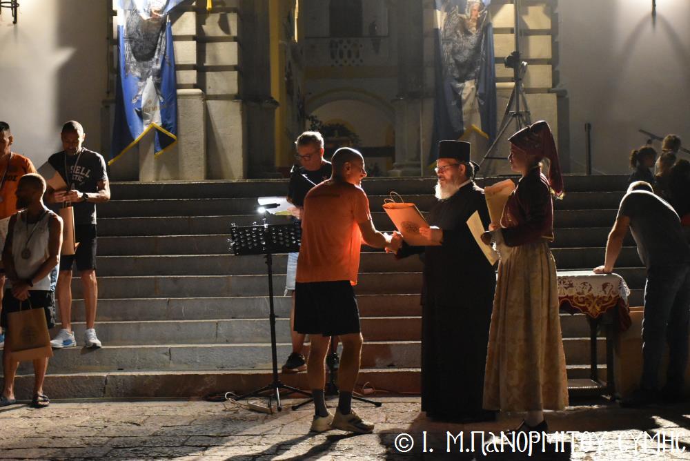 Μία ὥρα καί δεκαέξι λεπτά ἀργότερα, τερμάτισε πρῶτος ἐμπρός στήν Πύλη τῆς Μονῆς ὁ Συμαῖος Μιχαήλ Χατζηϊωάννου καί ἀκολούθησαν οἱ συμμετέχοντες δρομεῖς 43 τόν ἀριθμό, Ἕλληνες καί Ξένοι. Ὅλοι καταχειροκροτήθηκαν, ἀπό τόν Σεβ. Μητροπολίτη μας κ. Χρυσόστομο, τόν Πανοσιολ. Ἡγούμενο π. Ἀντώνιο, κληρικούς τῆς Νήσου μας, τόν Ἀντιδήμαρχο κ. Νικήτα Γρύλλη καί ἀρκετό κόσμο πού παρευρέθη στήν ἐκδήλωση.